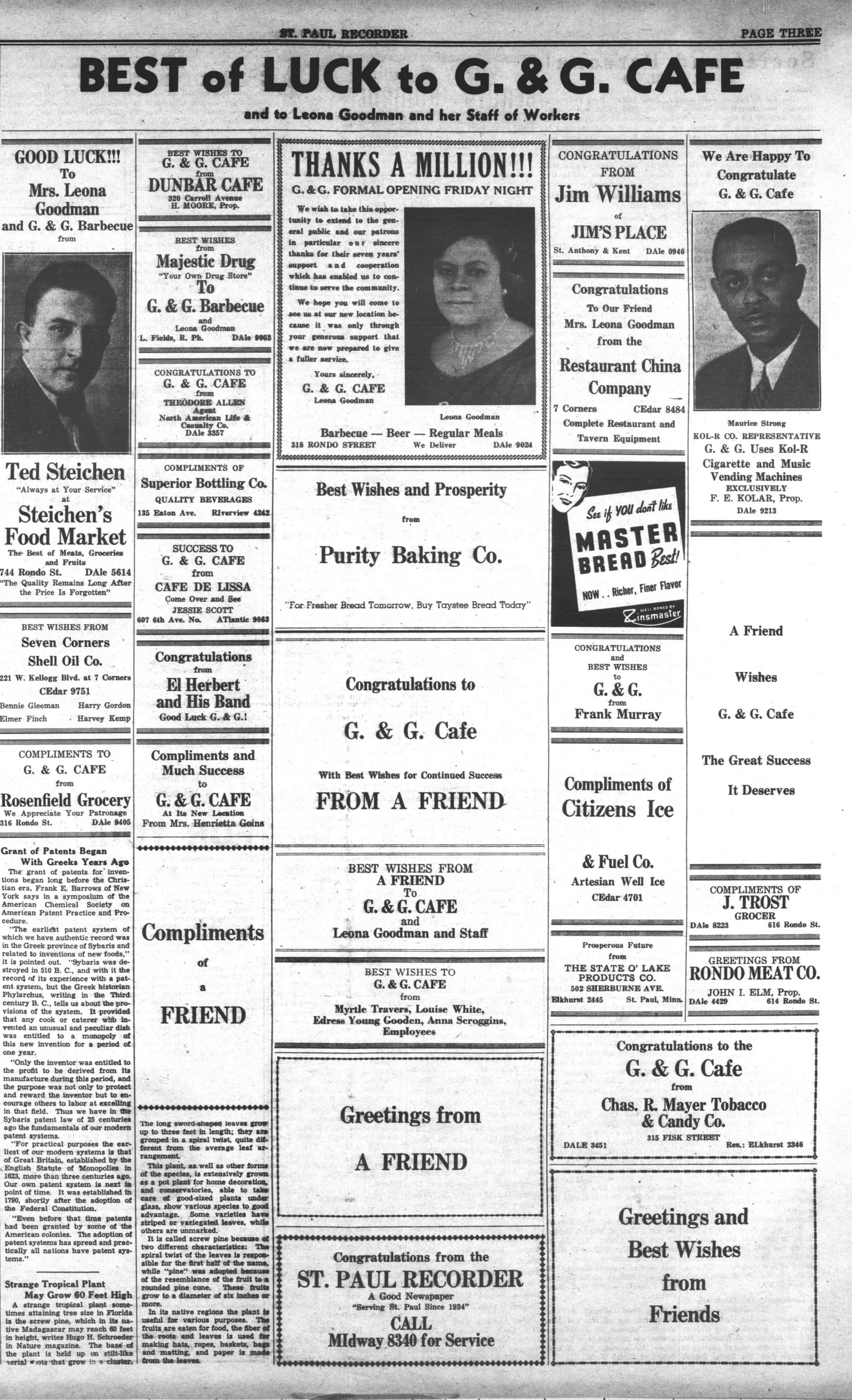 Good wishes for G & G Bar-B-Q on the opening of their new location at 318 Rondo Street, published in the St. Paul Recorder on Friday, June 9, 1939.